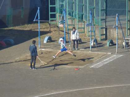持久走記録計測の後は、走り幅跳びの学習です。風が強い日ですが、子供たちは負けません。これも記録更新を目指して練習をしていました。