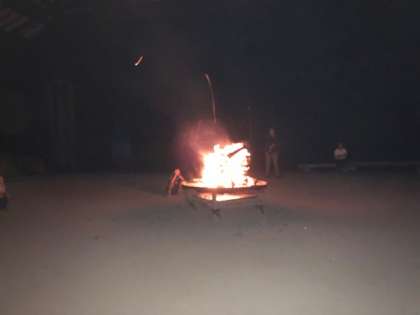 キャンプファイヤーの火がだんだん小さくなってきました。楽しい時間も終わりに近づきました。落ち着いた雰囲気になってきました。