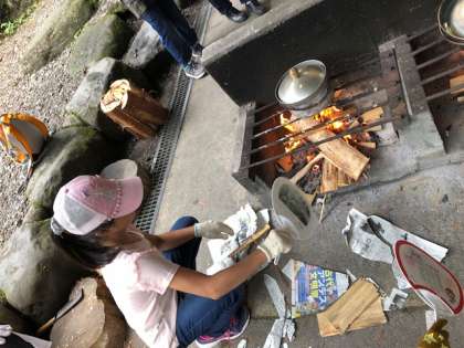昼食のためのカレー作りを行いました。少し、火を大きくするのに苦労しました。でも、どの班も、おいしいカレーができて、大満足でした。