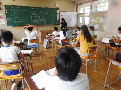 3年生は、体育館で体を動かしていました。こまめに給水タイムを取っています。5年生は、学習の振り返りを、プリントなどを使って行っていました。