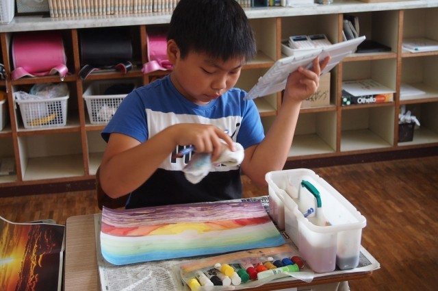 6年生の図工の授業の様子です。色の濃淡や色の混ぜ合わせ方に注意しながら「空」を描きました。
