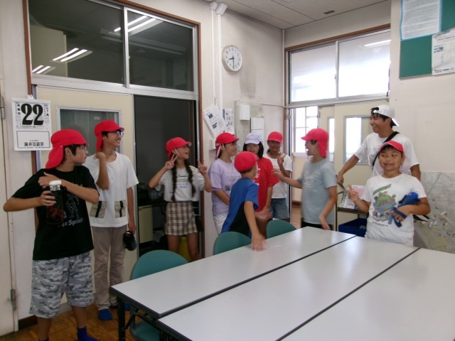 暑さ対策も万全です。途中で涼しい室内に入って、水分補給をしています。