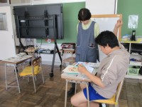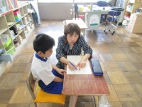 1組は英語の学習です。自分の名前の書き方を学習した後、フォニックスに取り組んでい...