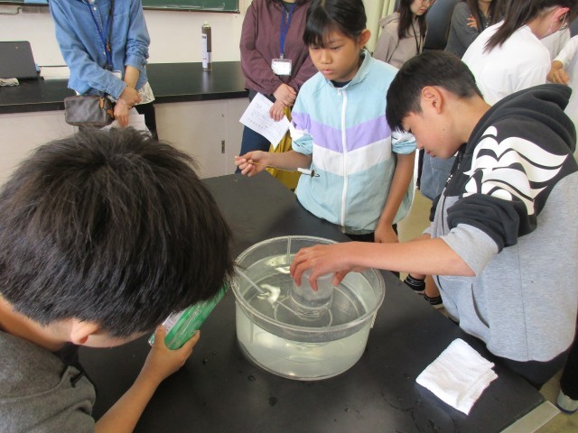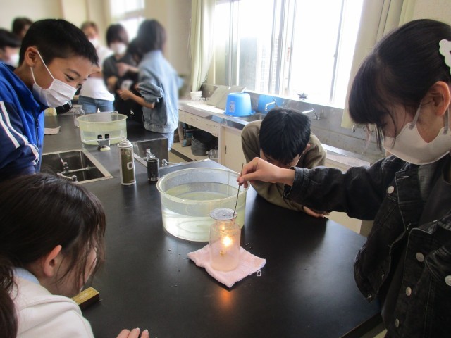 2組は、異なる気体の中に入れたろうそくの火がどのように変化するか予想をして実験をしています。