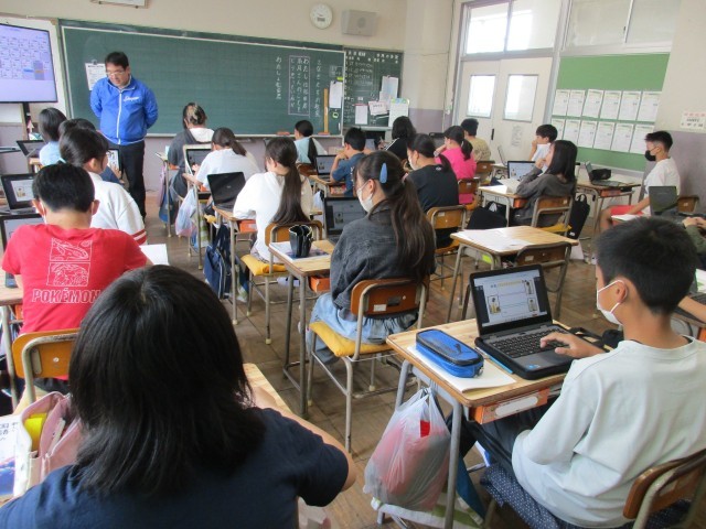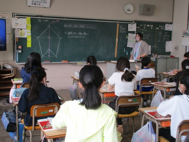 4月20日(月)6年生 国語・算数 公開日 2026/04/20 更新日 2026/04/20 6年生 1組は、物語文の登場人物の気持ちを考えています。ロイロノートを使って友達の考えを共有しています。2組は、対称の学習です。図を見ながら、対称の軸との関係を考えています。
