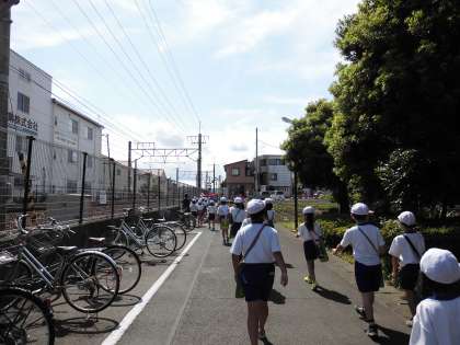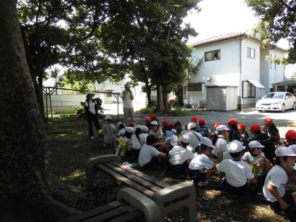 今日は松長方面に校区探検に行きました。旧道沿いをずっと歩いて、片浜駅から神明塚古墳のほうへ行きました。結構来たことがある子が多かったです。古墳の説明を市川先生に聞いて、周りや神社を見学しました。