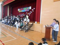 修学旅行、出発式です。出かけます。