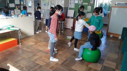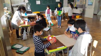 今日は、児童会主催の「ゲーム集会」です。たてわりの浜風グループの教室で、ゲーム屋さんを開きます。半分の人はお客さんとしてペアでいろいろな店を回ります。 お店の人は、自分の役割を一生懸命果たしていました。1年生も受付やカードへのシール貼りなど、お兄さんお姉さんと一緒に楽しそうに遊び、お仕事も楽しんでいました。