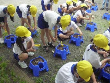 1年生は、朝顔の種まきをしました。鉢に土を入れて、穴を5つあけて植えました。
