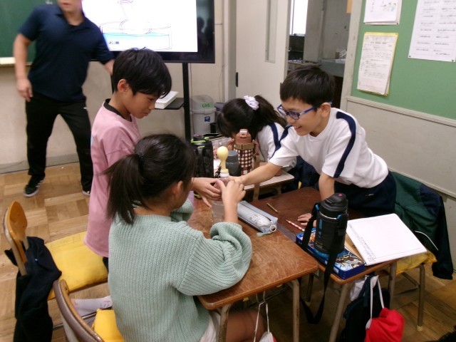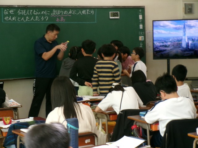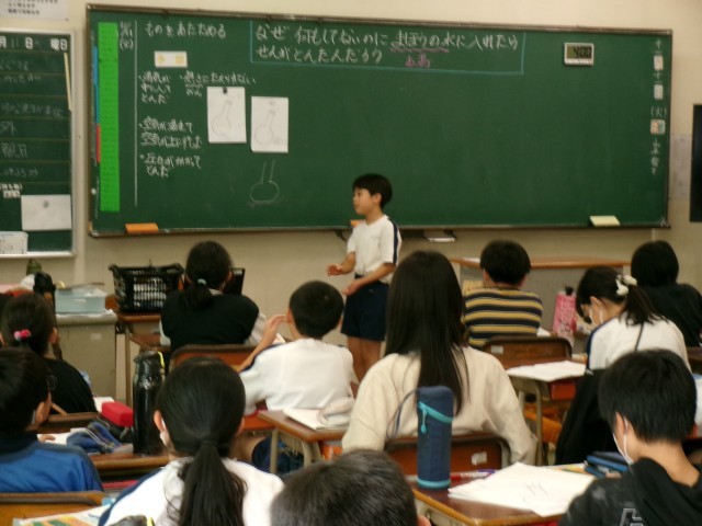 空気をあたためるとどうなるのだろう?という学習問題に迫る授業でした。いくつかの実験を重ねるうちに、子供たちが予想が正しいかどうかを確かめていました。子供たちの言葉で授業が進んでいき、次回の授業でさらに本質に近づいていくようです。