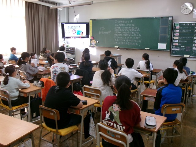 今日の朝会は、オンラインで行いました。このところ、多くの学校で風邪や感染症などの欠席者が増加しているとの話を聞いています。そのため、健康な生活を送るためのアドバイスを中心に、林教諭が講話をしました。子供たちは、自分の生活を振り返りながら聞いていました。