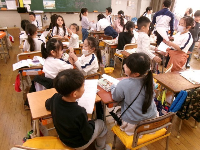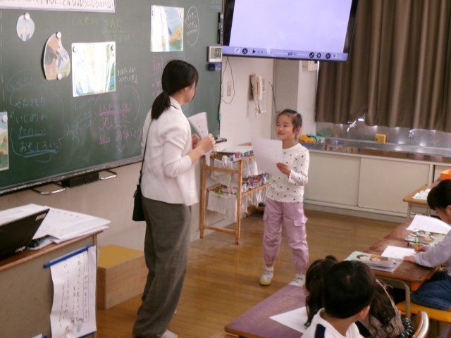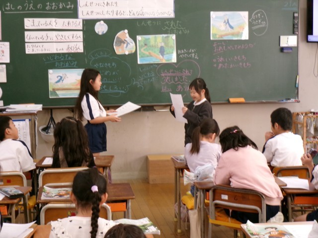 1組で道徳の授業研究が行われました。「親切」がテーマの「橋の上のおおかみ」というお話をもとに、道徳の時間を進めていました。話の一場面を切り取って、ペアで実際に演技したり発表したりすることで、気持ちを想像することができました。