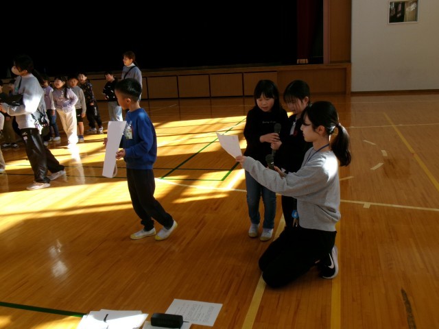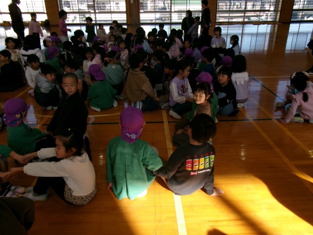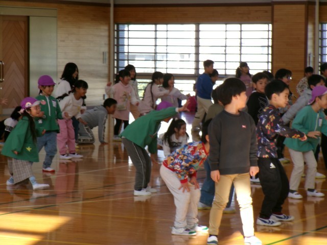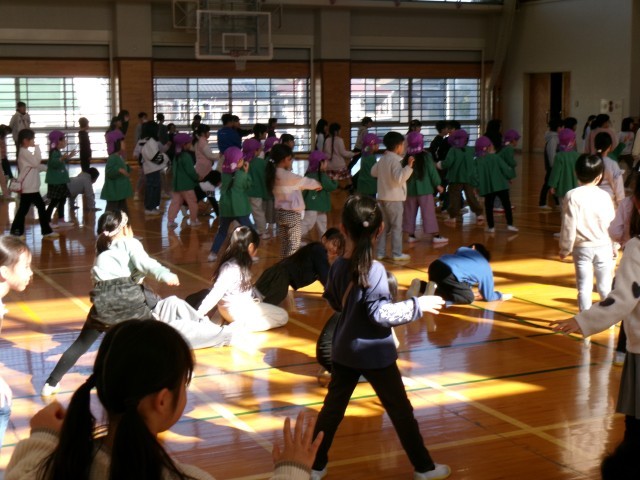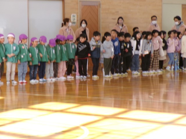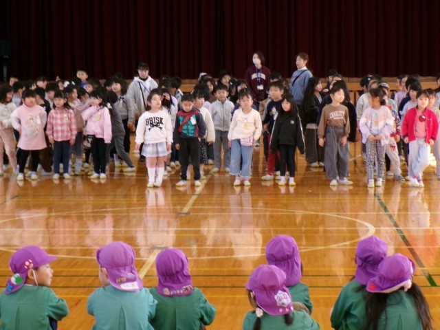 1年生から校歌とダンスの披露をし、その後、みんなで遊びました。「猛獣狩り」という集合ゲームと「だるまさんころんだ」をしました。みんな仲良く笑顔いっぱいでした。