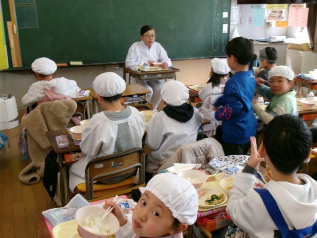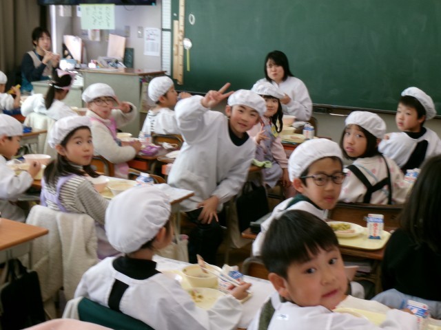 給食記念週間のため、いつもおいしい給食を作ってくださっている調理師さんが、各クラスに訪問し一緒に給食を食べています。子供たちの質問に答えたり、おいしい給食の話をしたり、笑顔いっぱいの温かい雰囲気でした。今日は、2年生のクラスへの訪問でした。
