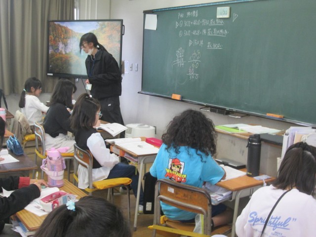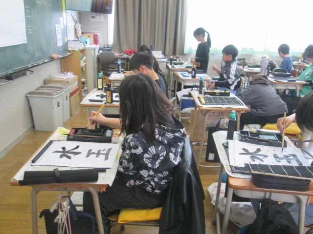 3年生の教室では習字の学習が行われました。 今回は筆の運びを意識しながら「水玉」という文字に挑戦。一画一画、筆先に神経を集中させて、どの子も丁寧に筆を動かしていました。また、算数の時間には「1年間のまとめ」に取り組みました。難しい問題にもあきらめずに挑戦し、わからないところは先生からヒントをもらいながら、自分の力で解き進めていました。