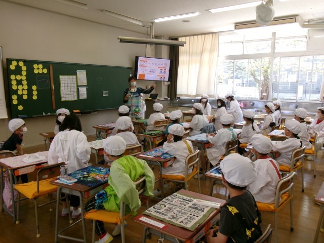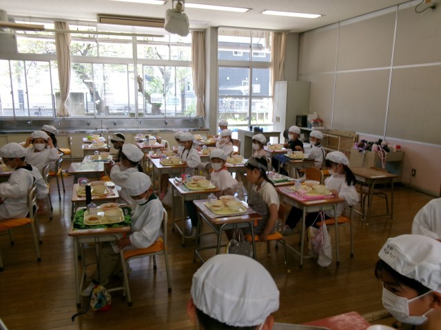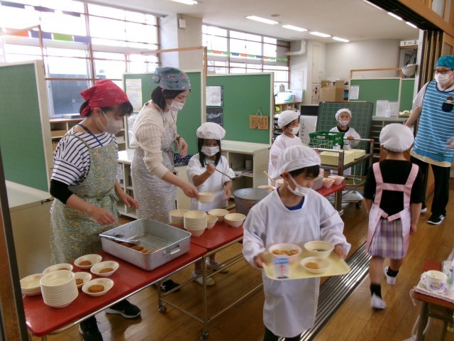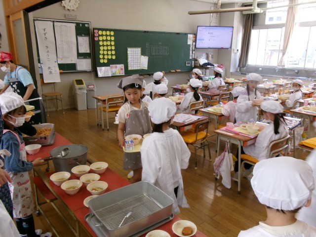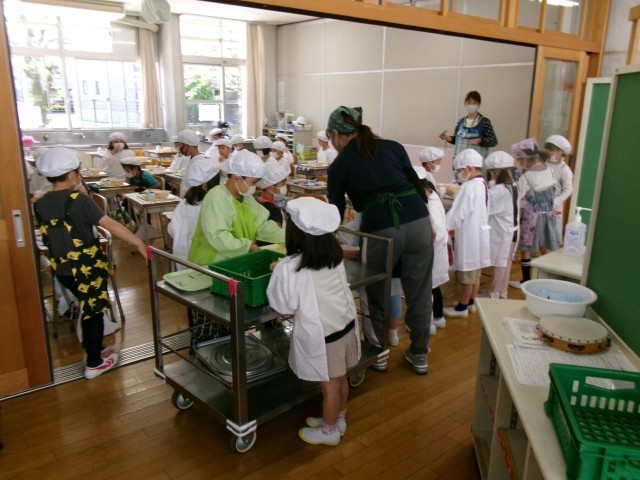 給食当番が自分たちで配膳し、それをみんなが取りに行きました。「楽しみ~。早く食べたい!!!」とのわくわくした声があちらこちらから聞こえてきました。