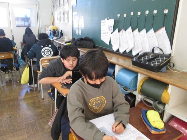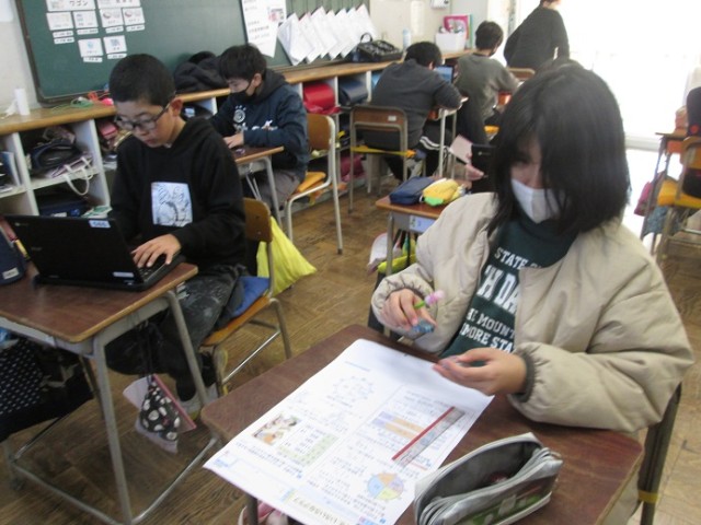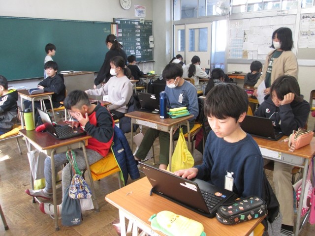 5年1組は算数「グラフ」のテストです。円グラフなどを作成するので時間がかかるテストです。終わった子はChromebookの操作の練習です。タイピングの腕前もだいぶ上達しています。
