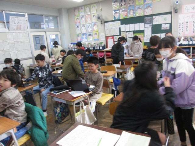 4年1組は、学習発表のリハーサルです。江原学習を発表する子、ドリームツリーを発表する子に分かれます。それぞれが発表に向け準備をしています。