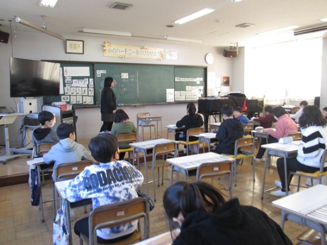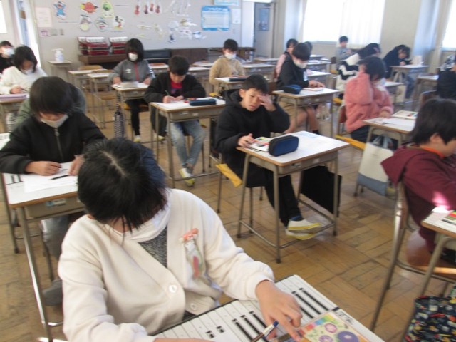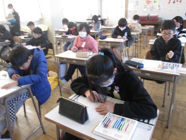 4年3組は音楽の学習です。旋律の変化を色や言葉で表しいています。体を動かしながら聞いている子も多く、それぞれが感じた色を塗っていました。
