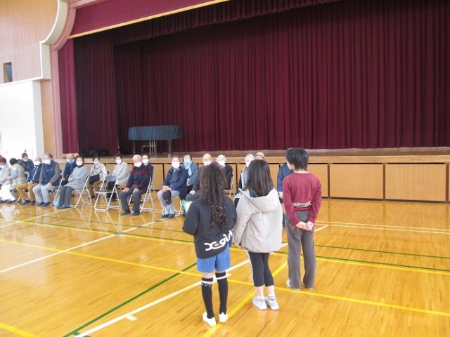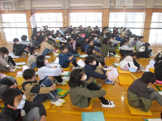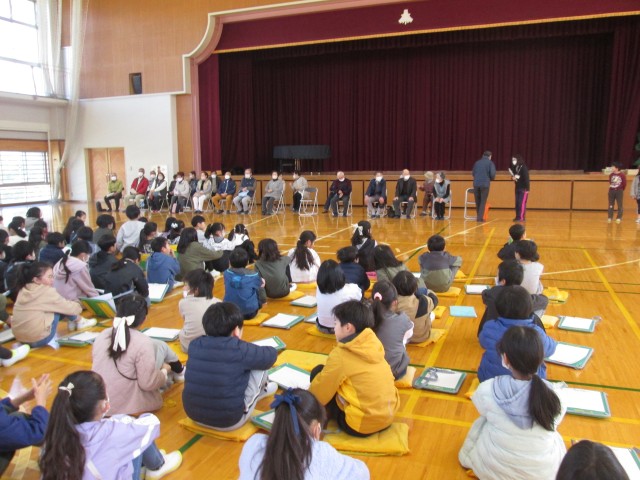 今日は金岡シニアクラブの皆様にご協力いただき、3年生の「昔のくらし・遊び体験教室」が行われました。たくさんのシニアクラブの方にお越しいただき、子供たちもとてもわくわくしている様子です。体育館で全体会が行われたあと、早速体験教室のはじまりです。