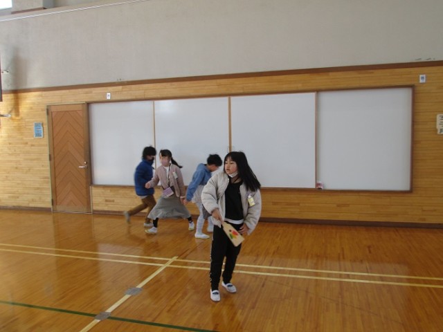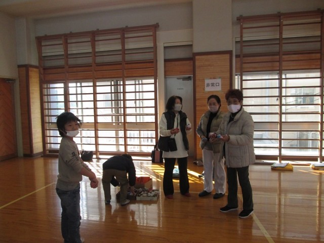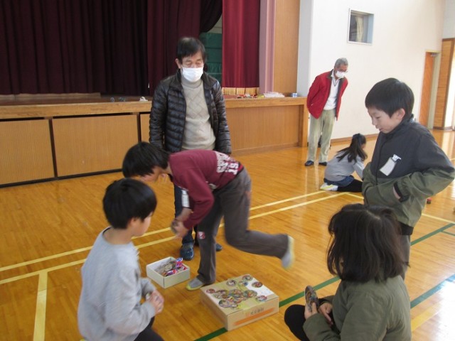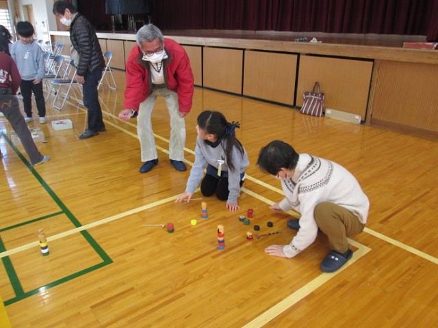 昔の遊びでは、コマ回し、羽子板、ビー玉、お手玉、だるま落とし、めんこなどを体験しています。子供たちは、コマ回しになかなか苦戦している様子でしたが、こつをつかむと上手に回せる子が出始めていました。羽子板もバドミントンとは勝手が違いますね。