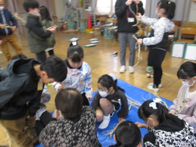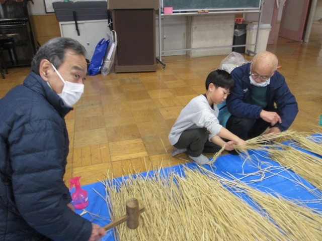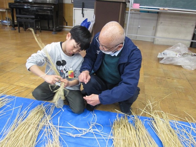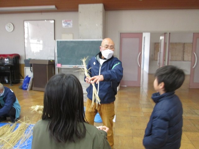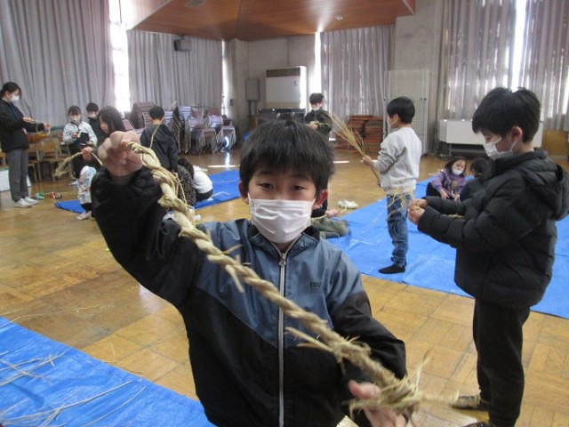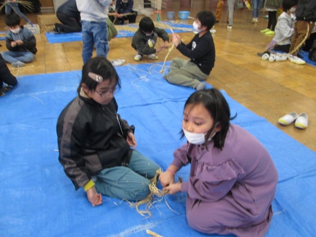 ひまわりホールではしめ縄体験です。わらを編んでいくという体験はなかなかしたことがないと思います。シニアクラブの方に教えていただきながら、わらを編んでいきました。「失敗してもいいんだよ。体験することが大事!」と励まされながらやっていました。