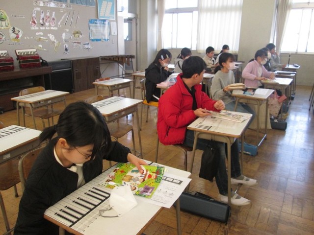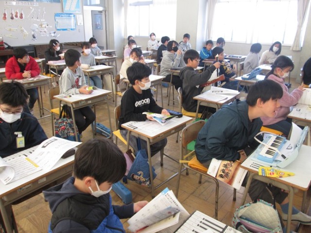 5年2組は、音楽「音階の音で旋律づくり」という学習です。音の上がり下がりなどを意識しながら自分で短い旋律をつくりました。今日はそれをみんなのつくったものとくっつけて長い旋律にしていくという学習でした。