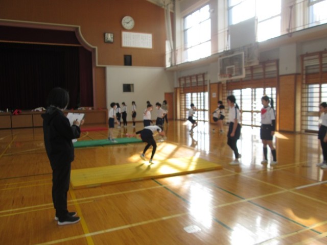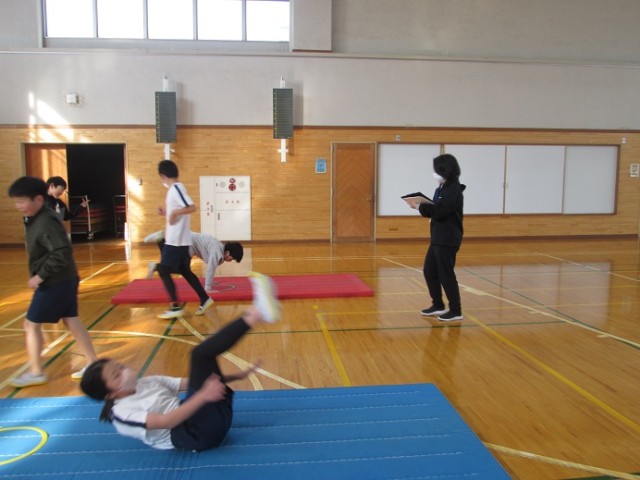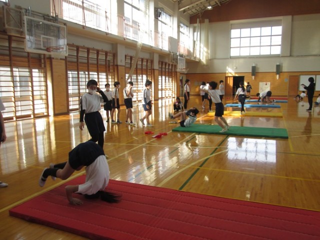5年3組は体育「マット運動」です。伸膝前転や伸膝後転にチャレンジしていましたが、すぐに膝が曲がってしまいます。それでも何度も何度も繰り返し練習していました。できた子には友達が自然に拍手していました。