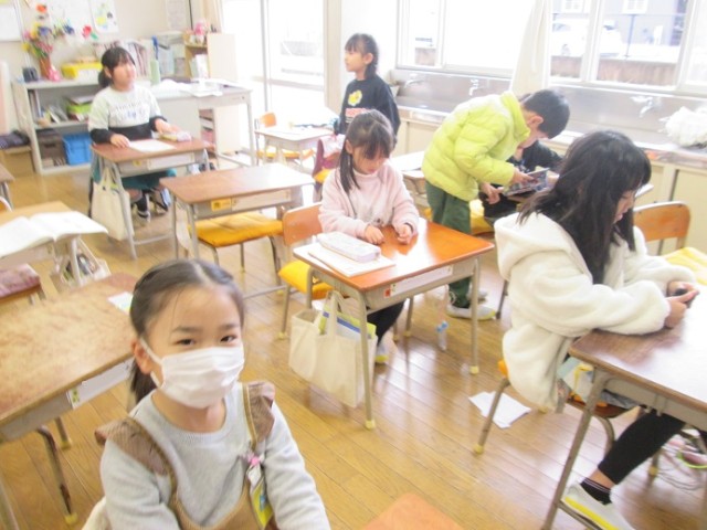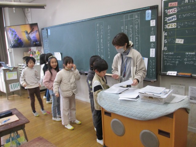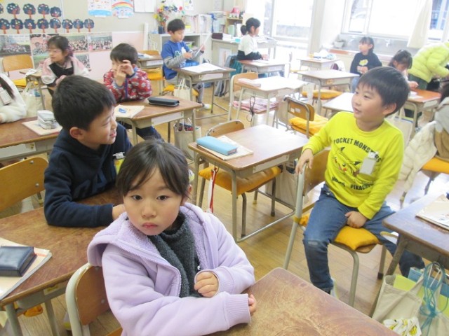 この時間、1年生は全クラス国語の授業です。1年1組は「おてつだいをしたよ」です。順番に、先生からアドバイスをもらっています。アドバイスをもらったら子はそれを直していきます。自分の番が来るのを楽しみに待っている様子でした。