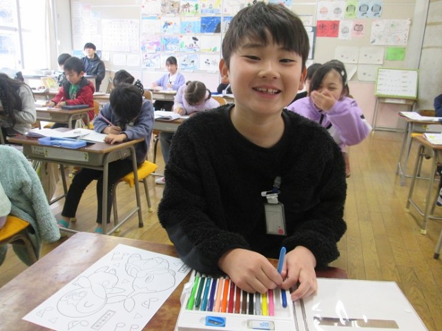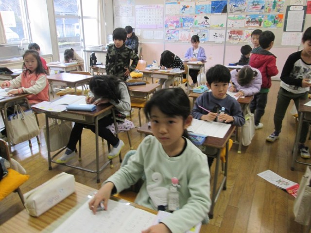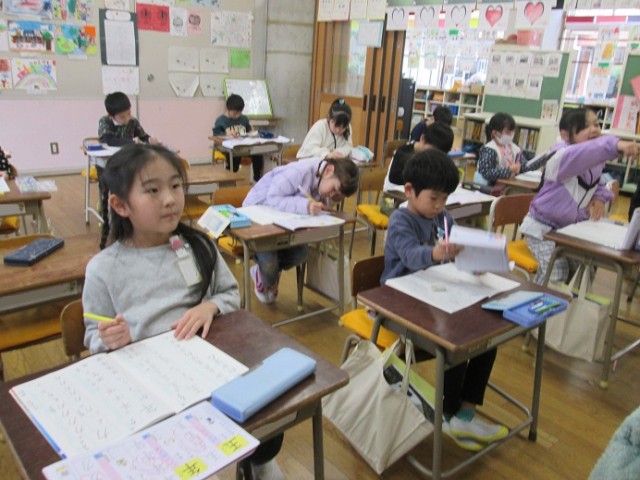 1年2組は「漢字ドリル」と「ばっちりノート」に取り組んでいます。「校長先生はどうして写真撮るの?」と聞く子がいました。「ホームページにみんなの頑張ってるところを載せるためだよ。ホームページも見てね」と伝えました。