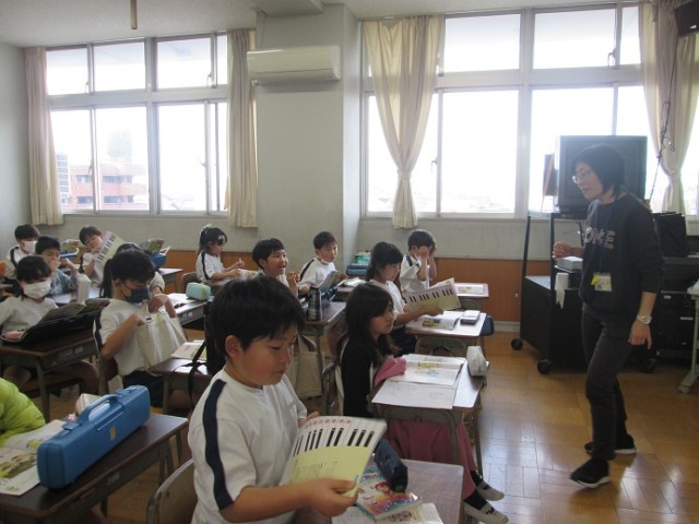 2年1組は音楽「エンターティナー」の鑑賞です。「弾んでいる感じ」「楽しい」「わくわくする」「スーパーで流れてそう」などいろいろな意見が出ていました。