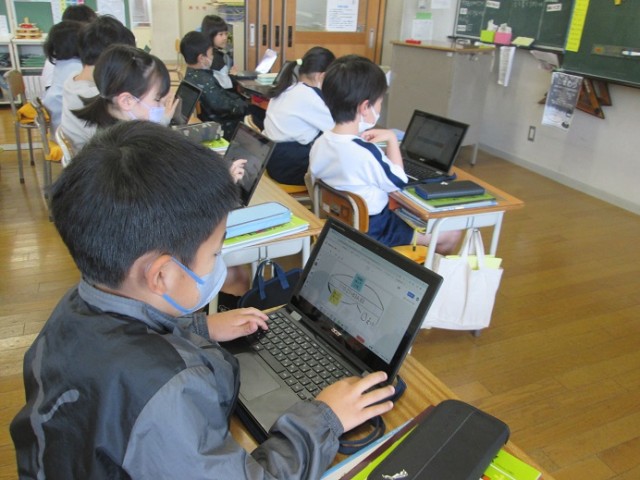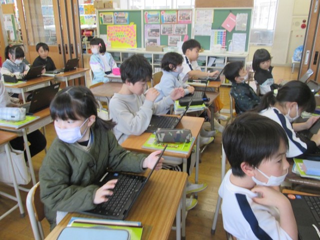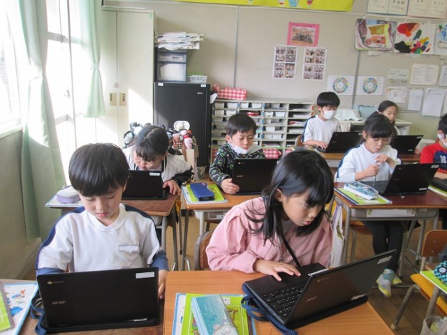 2年3組は算数「テープ図をつかって考えよう」の学習です。Chromebookを活用してテープ図に書き込んでいます。2年生もChromebookの操作が、本当に手慣れてきました。