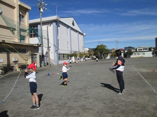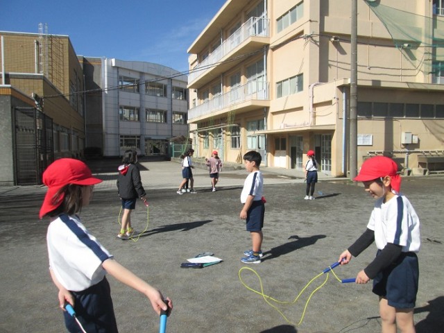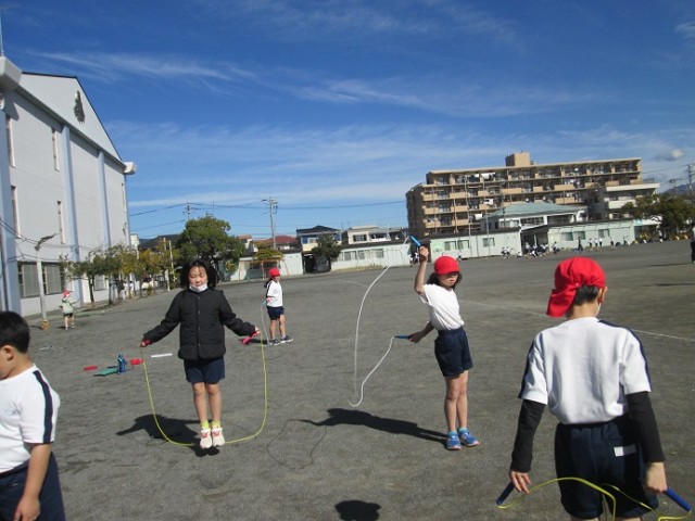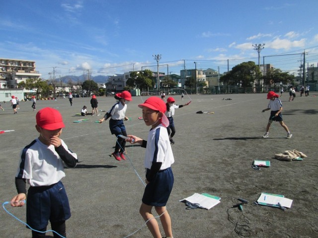 3年1組は体育「なわとび運動」です。予定黒板には「今日こそラスト!」と書いてありました。縄跳びカードはどのくらい進められたかな?