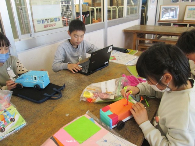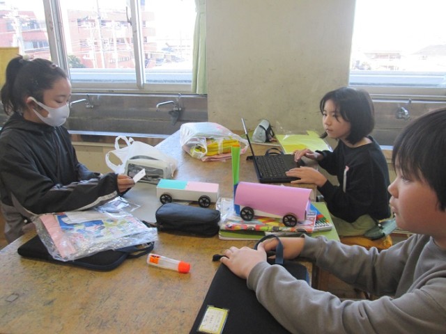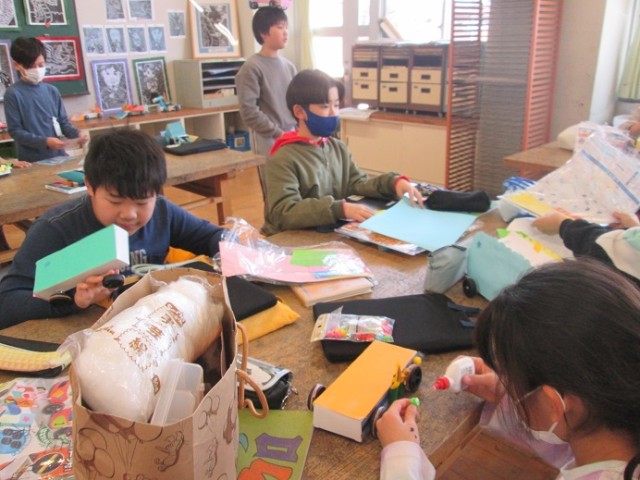 4年4組は図工「ゴーゴー!ドリームカー」です。曲線を工夫して作ったり、飾りで綿やレースを付けたり、2階建て構造にしたりアイデアあふれるドリームカーができはじめました。