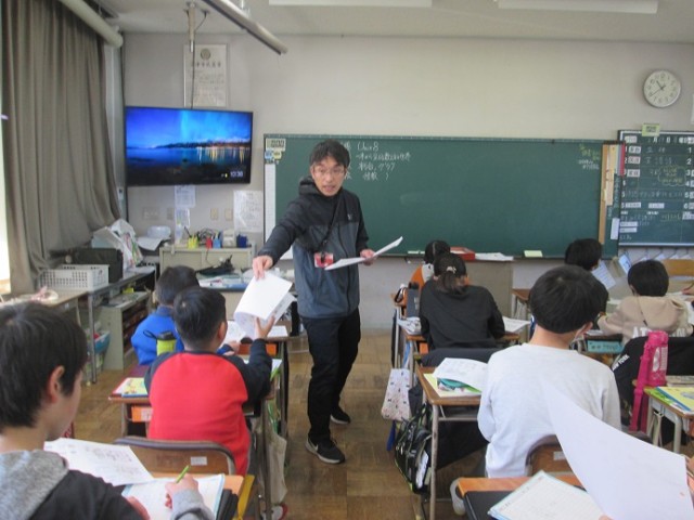 5年1組は英語のテスト返却の場面でした。結果に大喜びの子もいて、そのリアクションを見た子が「喜びの舞だね」とたたえていました。頑張った成果ですね。こちらまで微笑ましく思いました。