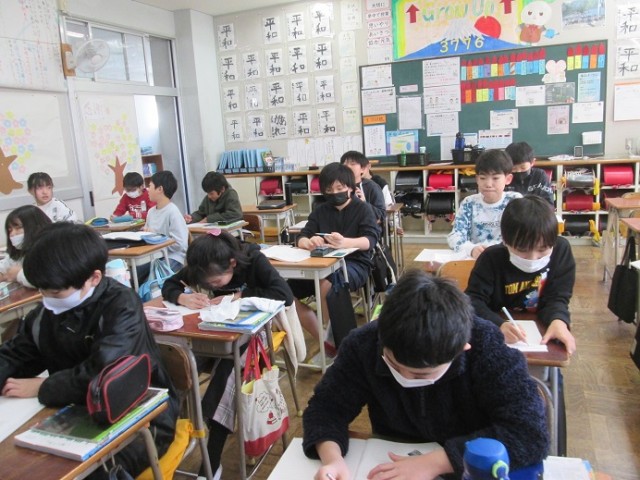 5年4組は、社会科です。「地震はどのようなことで起こり、被害を減らすためにどのような取組みがされているのだろう?」という課題をみんなで考えていきました。防災、減災について、深く学んでいます。