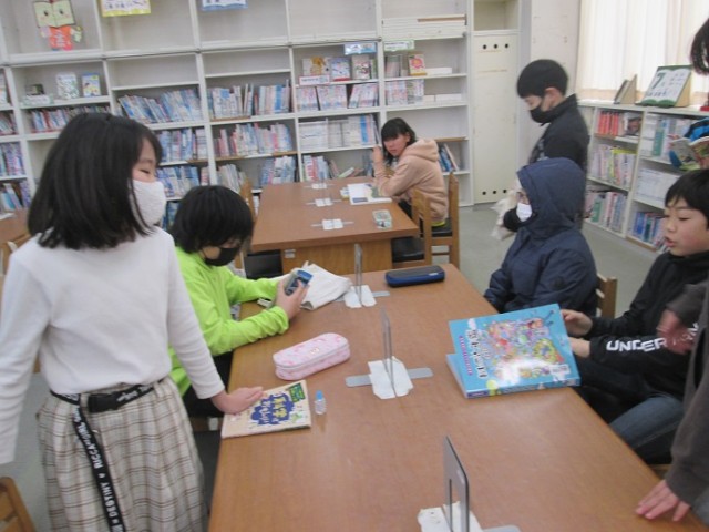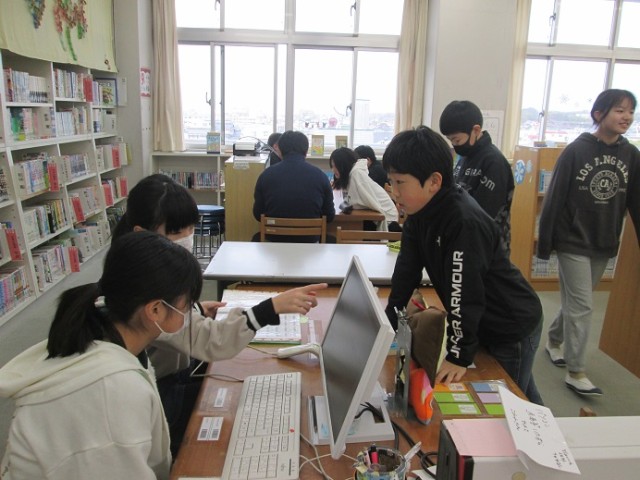 5年4組は学活の時間を利用して、図書館で読書です。「校長先生、この前、朝会で紹介していたのはこの本ですか?」と職業図鑑を見せてくれた子もいました。みんなは将来の夢について、どんなことを描いているのかな?