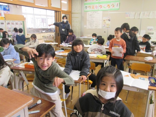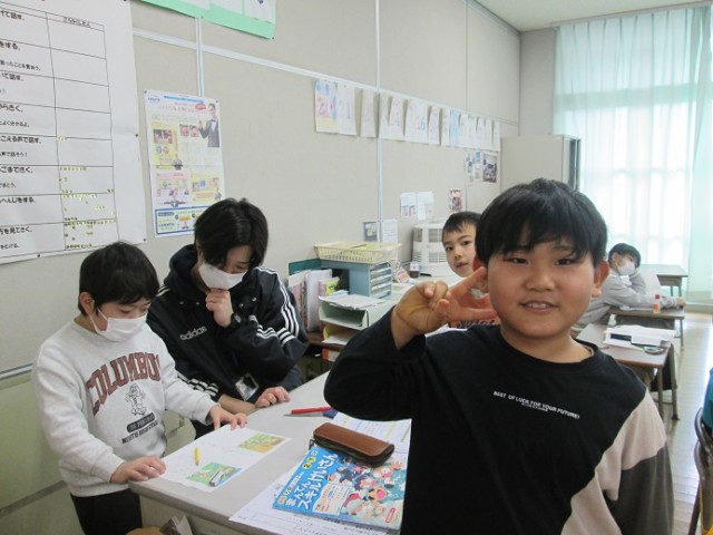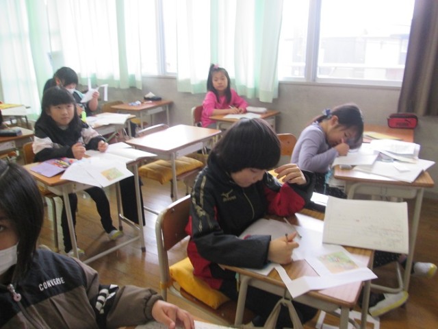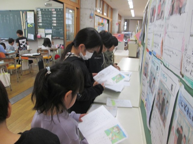 2年2組は国語「そうぞうを広げよう」の学習です。「僕のはもうできたよ。廊下にあるから友達に読んでもらう」という子もいました。みんなで、友達の作品を読み合っています。