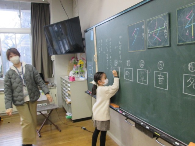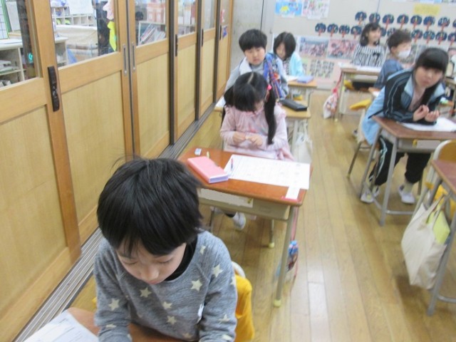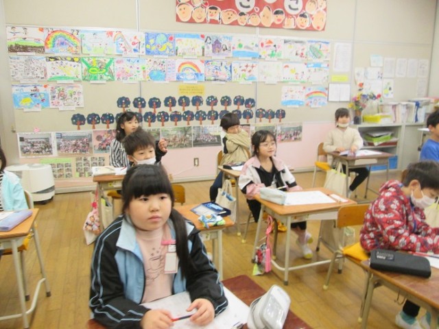 1年1組は国語「漢字」の学習です。糸、女、夕などの新出漢字を習った後、間違いやすい漢字の説明がありました。「貝という字は、見という字に似ています」と間違いやすいところを発表していました。