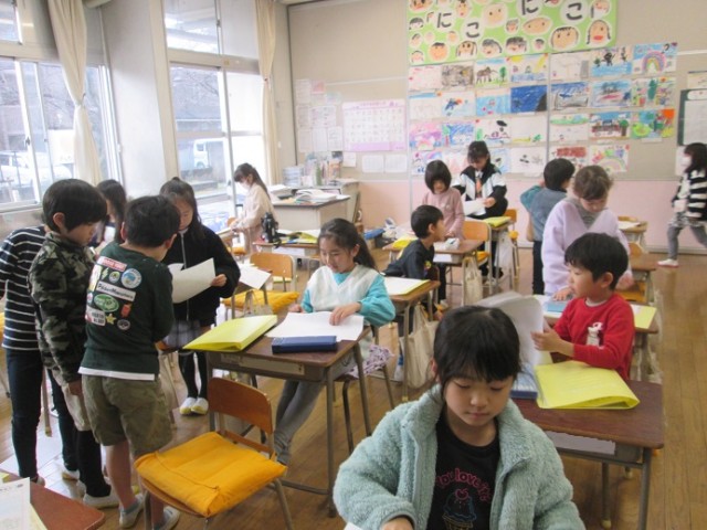 1年2組は、学風プリントの返却、ファイリングです。1年生の学習もまとめです。たくさん学習してきましたね。
