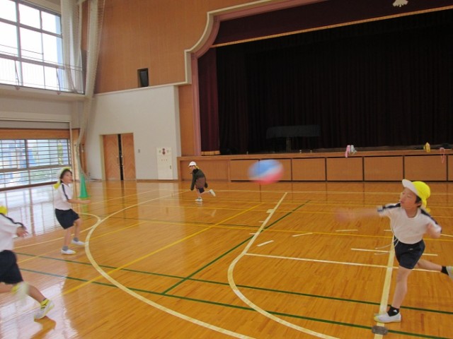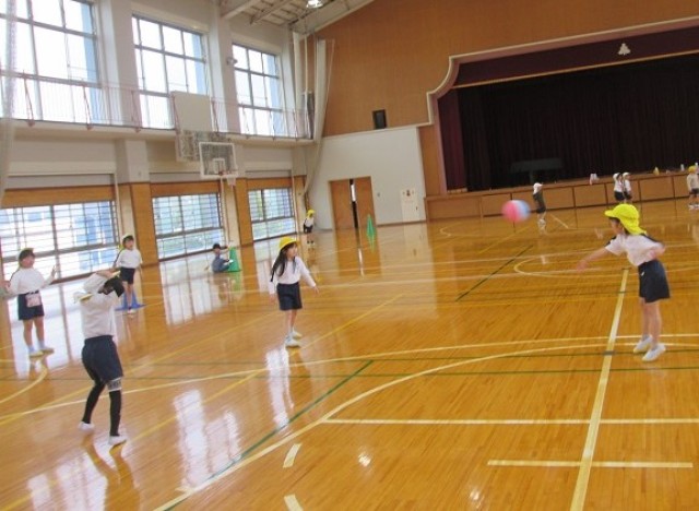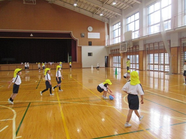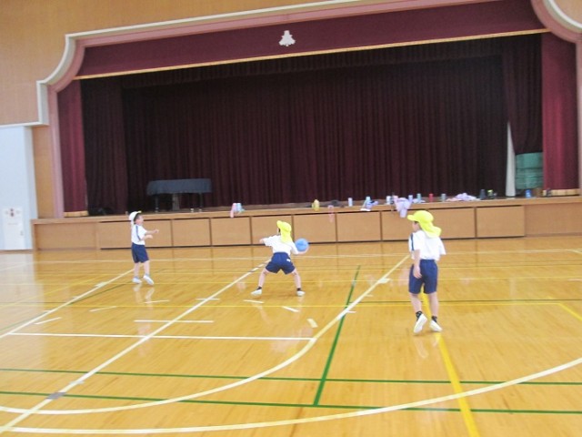 1年3組は体育「ドッジボール」です。うまくよけたり、キャッチしたり、投げたりしています。体育館で体いっぱい運動しました。