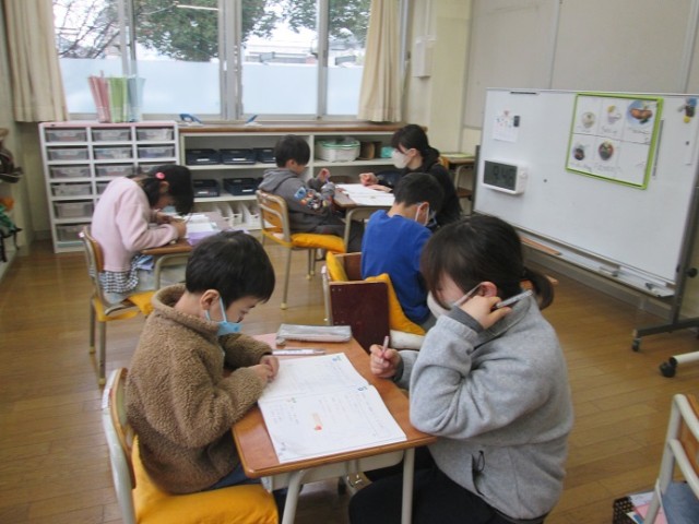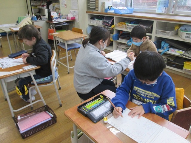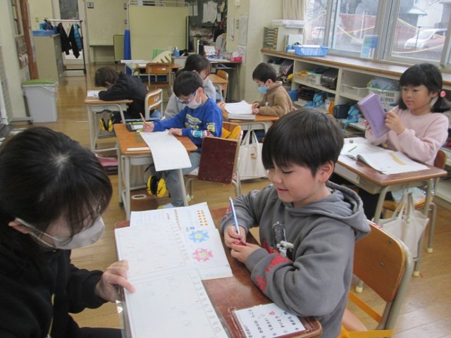 なかよし1組は、それぞれの進度に応じた算数です。たし算、ひき算、三角形、長さなど、それぞれがチャレンジしています。分からないところはそのままにしないで最後まで頑張っています。