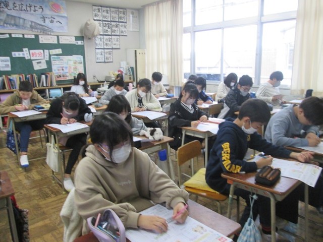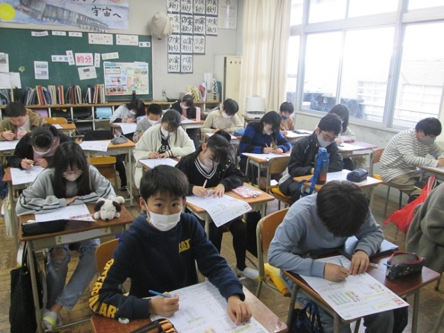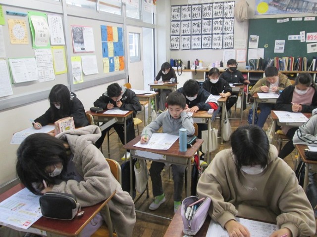 6年3組は算数「データの活用」の学習です。数値やグラフ読み取りなど、これまで学習してきたことを書き込んでいます。みんな、集中して取り組んでいます。6年生は卒業式まであと19日と、20日を切りました。1日1日を大切に過ごしましょう!