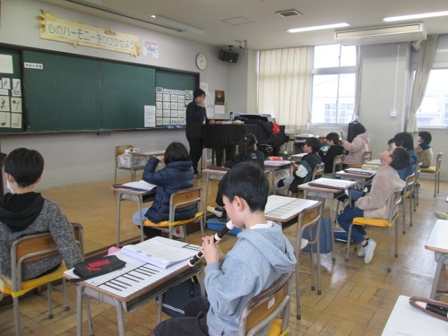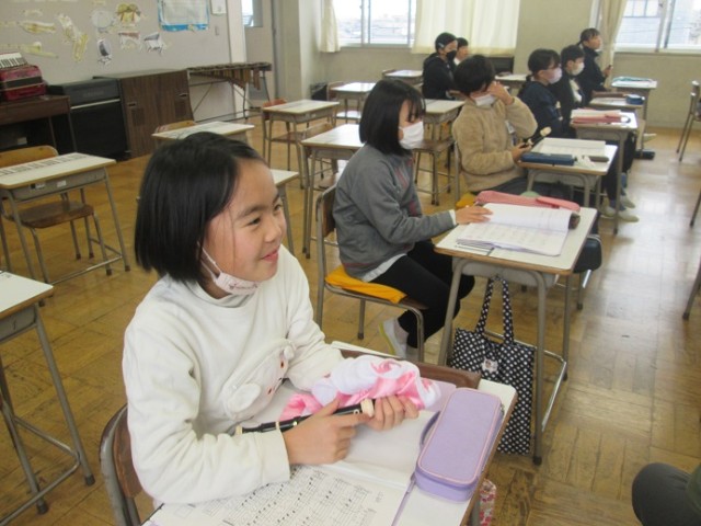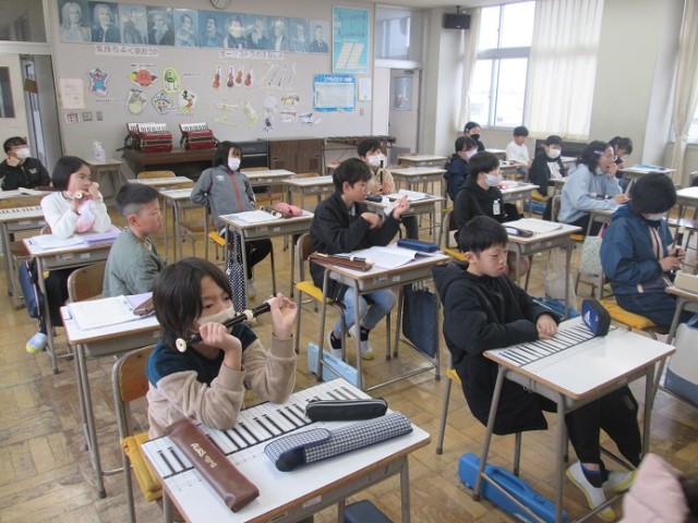 4年3組は音楽です。リコーダー進級テストにチャレンジしています。指の押さえ方に気をつけながら演奏しています。先生からも細かくアドバイスをもらっていました。4年生が終わるまでに何級までいけるかな?