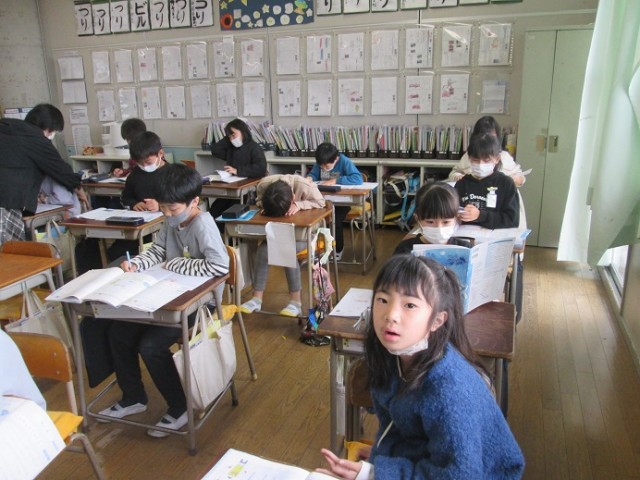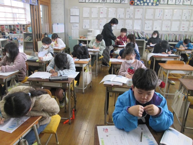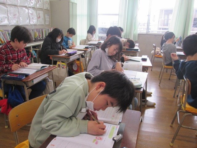 3年1組は書写「硬筆」です。文字の大きさや配列に気をつけながら、はがきの書き方を練習しています。バランスよくはがきが書けるようになるといいですね。