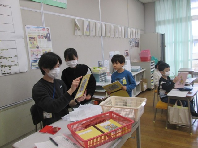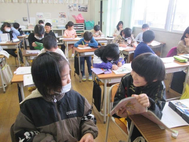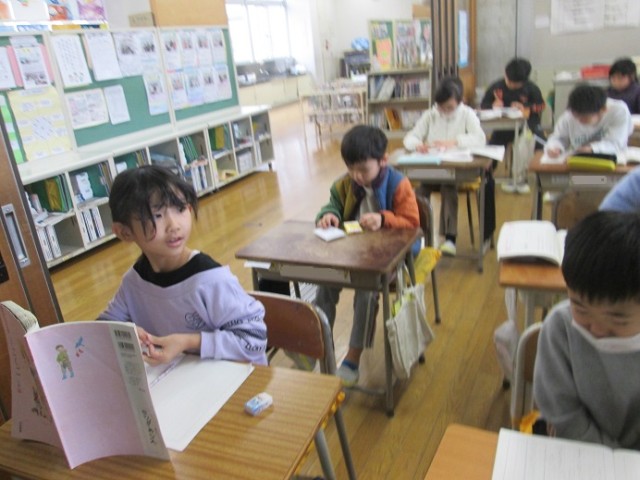 2年2組は、国語「ふしぎに思ったことやおもしろかったことを書こう」の学習です。書き終えたら先生に見せて確認してもらっています。どんなことが不思議に思ったかな?
