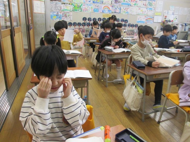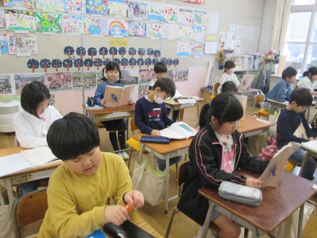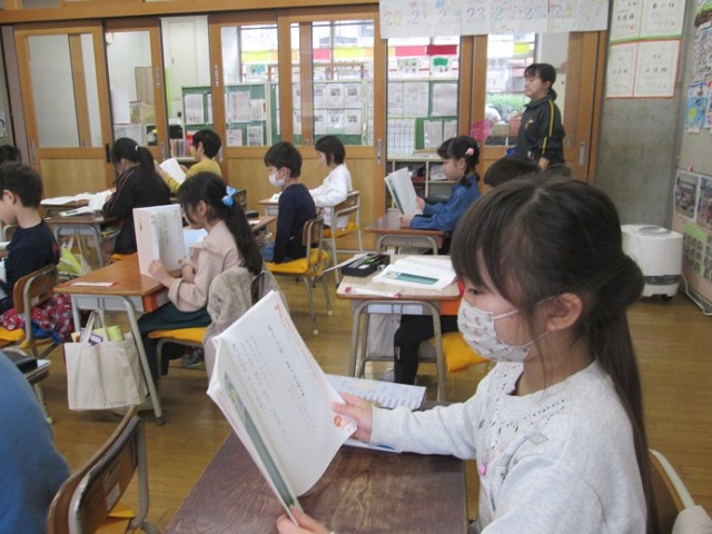 1年1組は国語「ろくべえ まってろよ」の学習です。先生の範読を聞いています。「ちょっと長いお話だからね」と先生。だんだん教科書の文も長くなってきていますね。もうすぐ2年生だもんね!