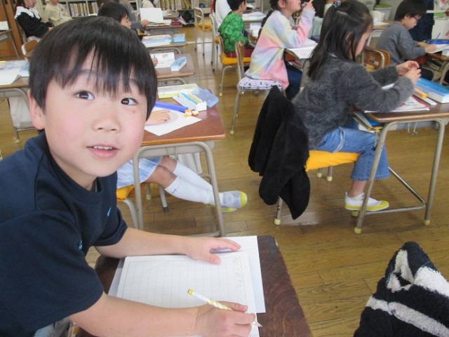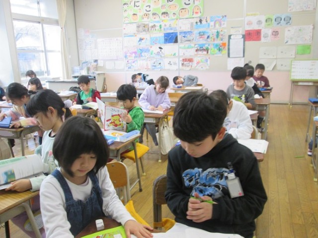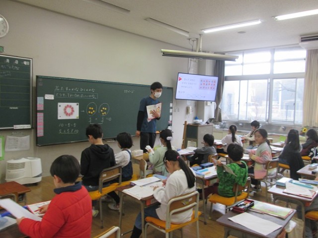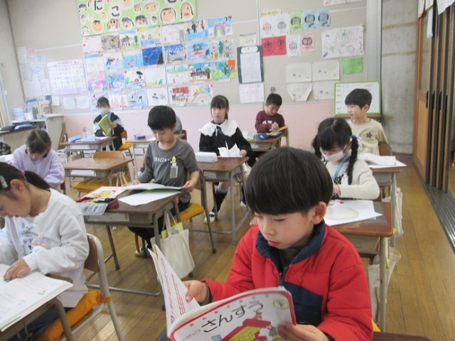 1年2組は算数「たすのかな ひくのかな」の学習です。図で考える子、ブロックで考える子など、自分の考え方で問題を解いています。