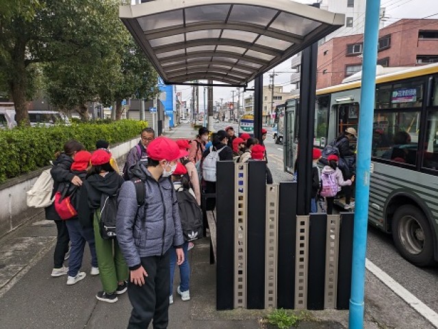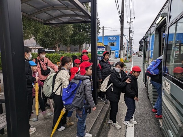 本日、仲よし学級の児童は、あわしまマリンパークへお別れ遠足に出かけました。金岡小前のバス停からまずは沼津駅行きのバスに乗車しました。楽しい思い出を作ってきてくださいね。