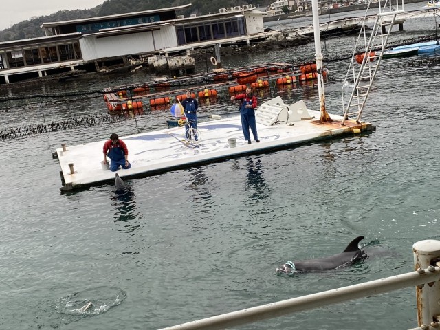 あわしまマリンパークでのイルカショーを見学しています。イルカの動きにみんな盛大な拍手をしています。